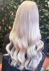 Our cold and cool Ice Blonde Tape In Hair Extensions are made with silky soft human hair, making them easy to wash and style, avoiding tangling and matting.
