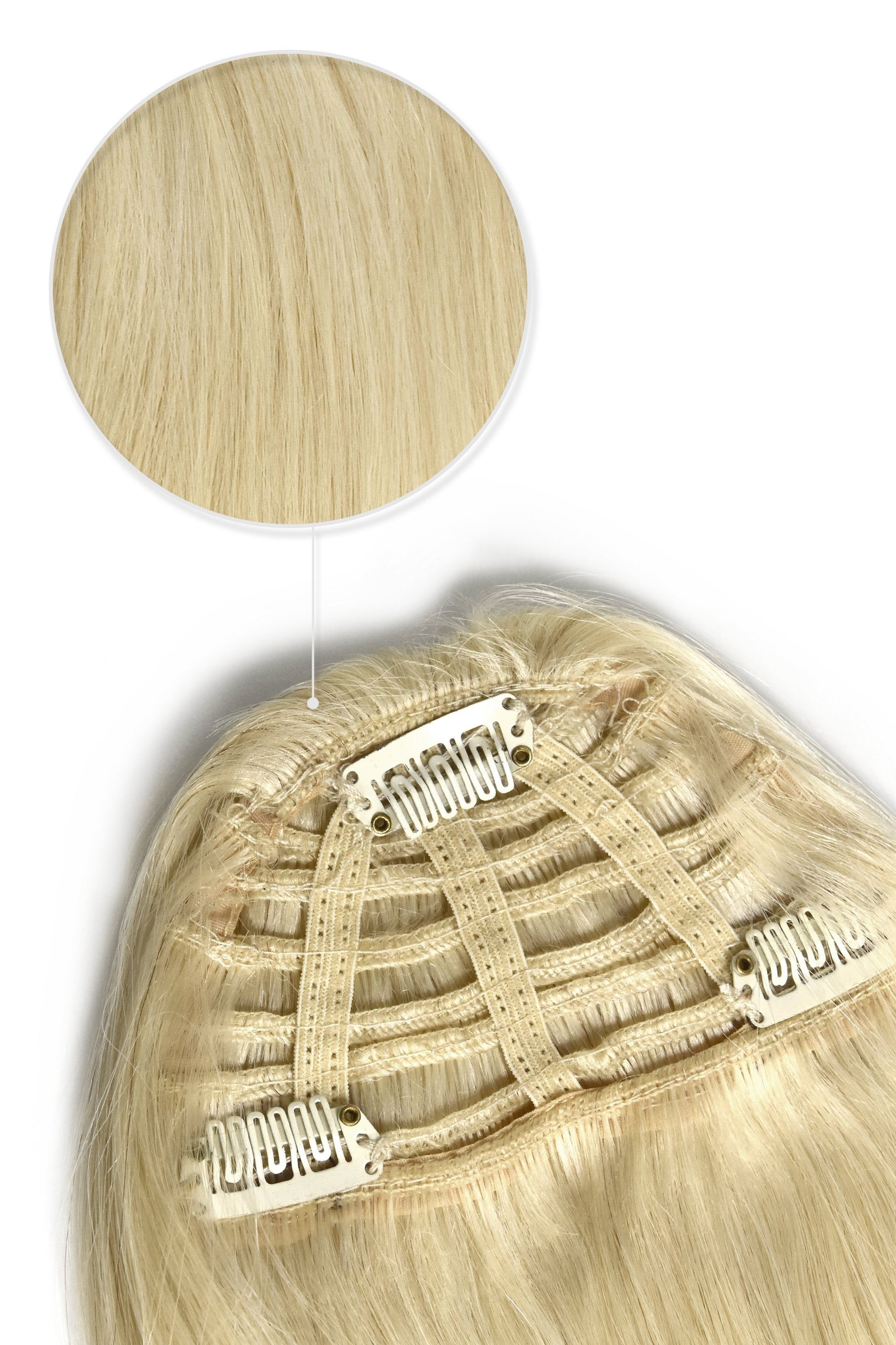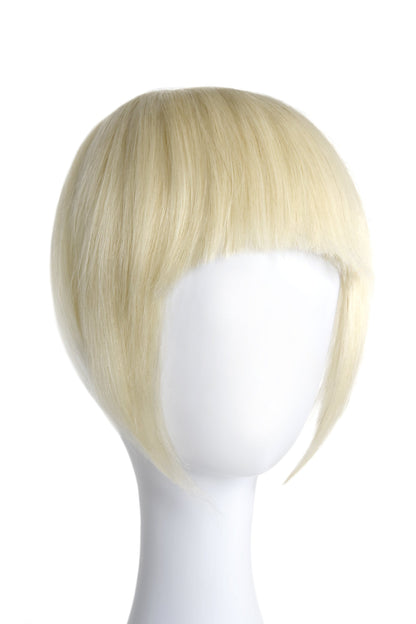 Instantly change your look with our Lightest Blonde Clip In Fringe (#60). Clips on securely to your existing hair. Lightest Blonde clip in fringe hair extension with full instructions included.