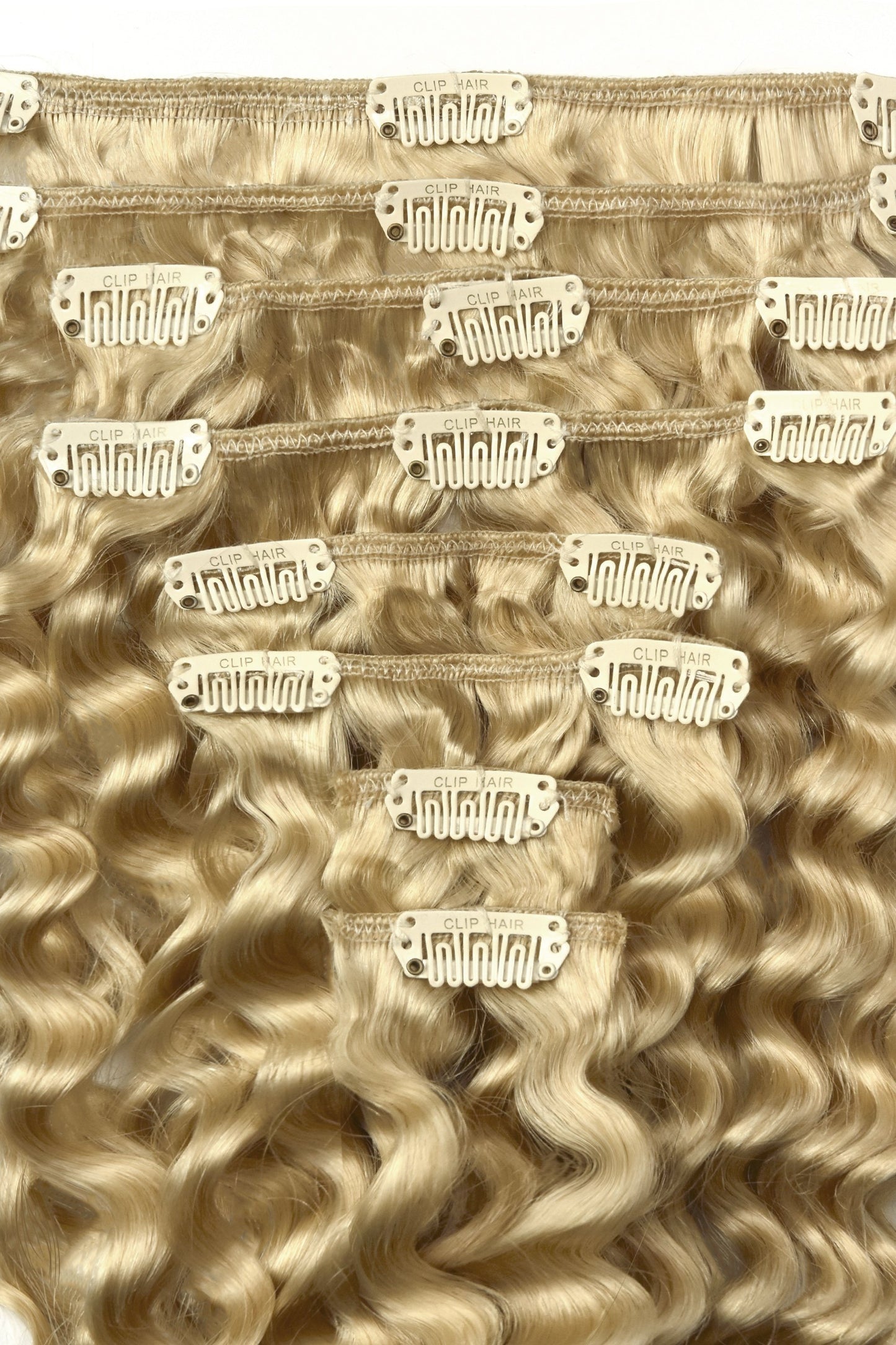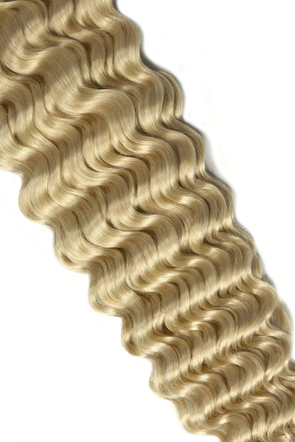 Our Deep Curl sets are the same high quality as the regular clip in hair extensions but have a permanent curl applied. Perfect for adding to already curly hair or increasing hair volume quickly and easily. The set contains a total of eight wefts complete with metal clips pre-attached. Light Ash Blonde (#22) clip in curly hair extensions with full instructions included.Please note: Length described below is of the hair when straight. Actual length will appear approx. 2-3 inches shorter.