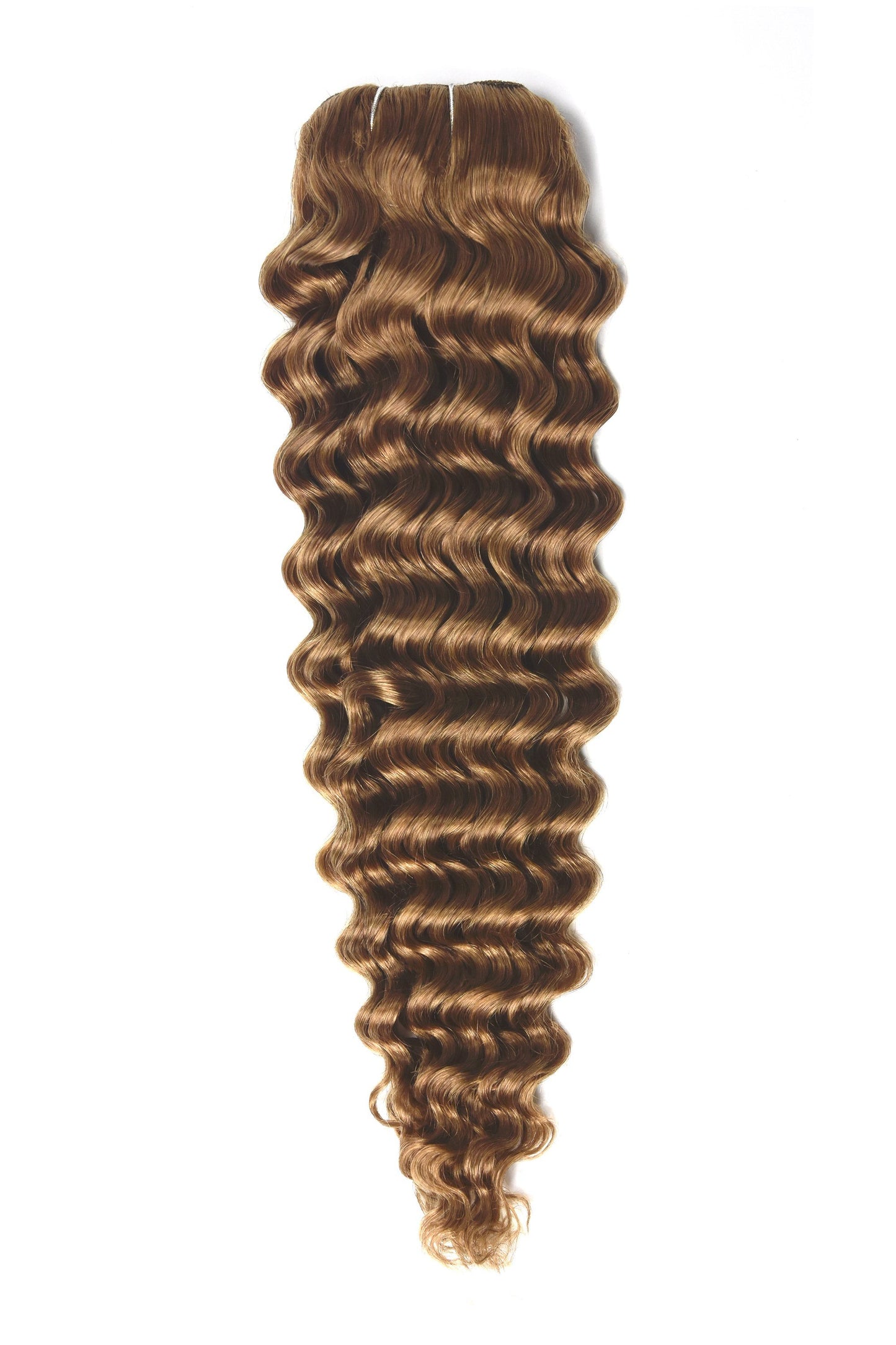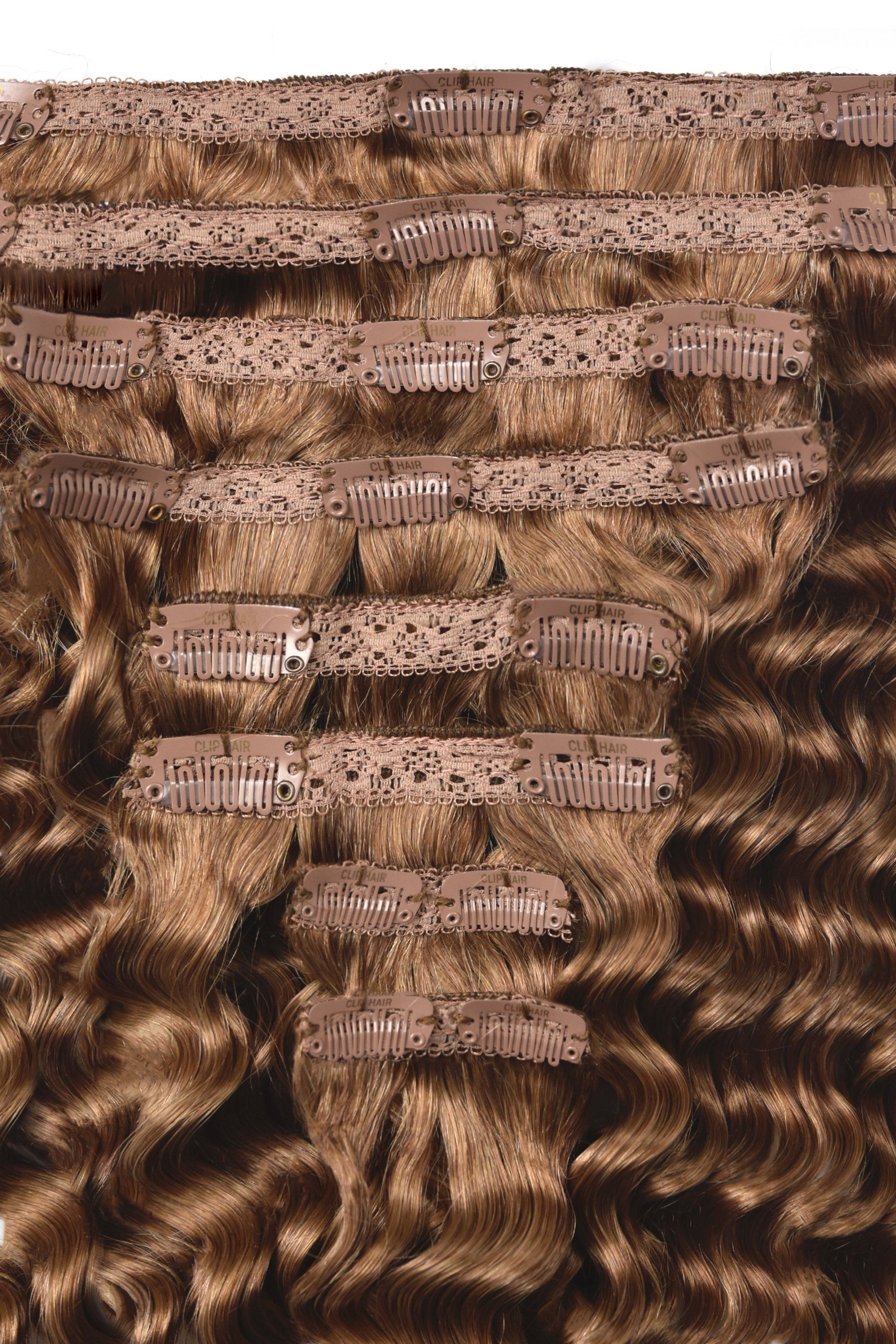 Our Deep Curl sets are the same high quality as the regular clip in hair extensions but have a permanent curl applied. Perfect for adding to already curly hair or increasing hair volume quickly and easily. The set contains a total of eight wefts complete with metal clips pre-attached. Light Auburn (#30) clip in curly hair extensions with full instructions included.Please note: Length described below is of the hair when straight. Actual length will appear approx. 2-3 inches shorter.