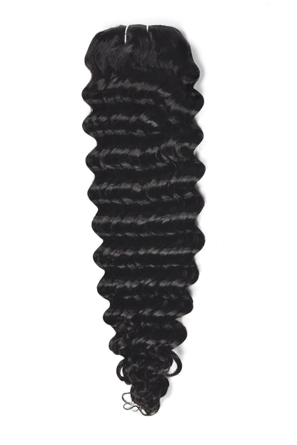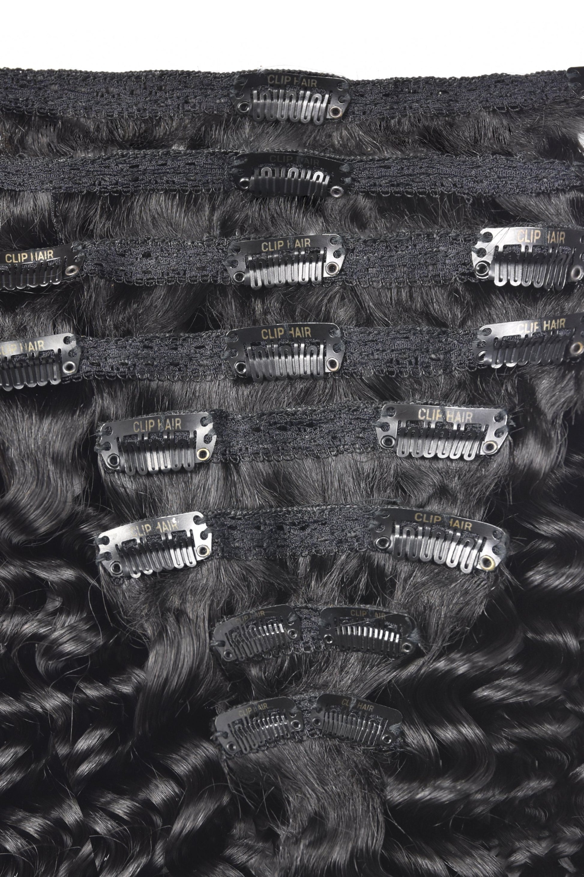 Our Deep Curl sets are the same high quality as the regular clip in hair extensions but have a permanent curl applied. Perfect for adding to already curly hair or increasing hair volume quickly and easily. The set contains a total of eight wefts complete with metal clips pre-attached. Off/Natural Black (#1B) clip in curly hair extensions with full instructions included.