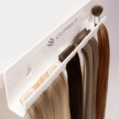 The perfect solution for managing all your extensions! This holder for hair extensions makes styling, washing, and applying extensions easier than ever. Designed with fine-toothed teeth, it securely holds all extension types, from clip ins to permanents, even tiny nano tips. Lightweight and versatile, it easily attaches to walls without causing damage and even fits onto hairdressing trolleys for professional use. Ideal for your home or salon, this clip in hair extension holder ensures your extensions stay ready to use.