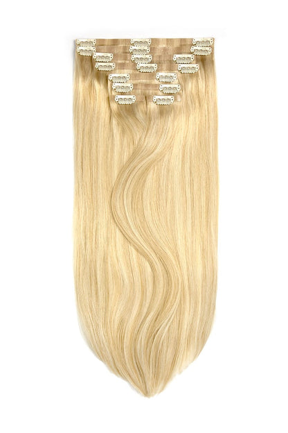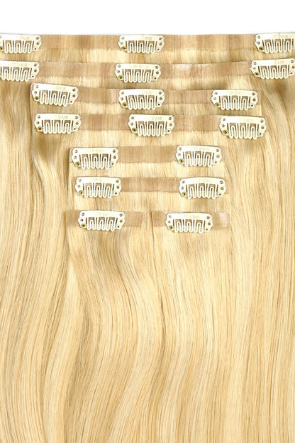 Våre Light Golden & Barbie Blonde (#16/60) Double Drawn Seamless Clip In Hair Extensions er et komplett hodesett som veier 150 g. Sømmen er myk og ligger flatt mot hodet, slik at extensionsene dine nesten ikke kan oppdages. Den sømløse teknologien beskytter også håret mot å miste og floke seg.