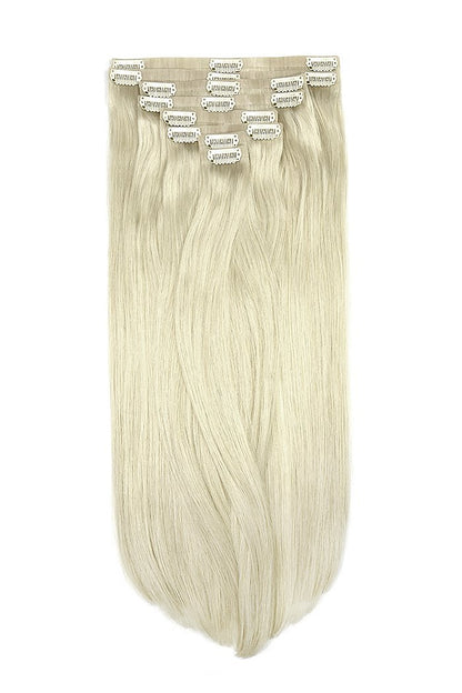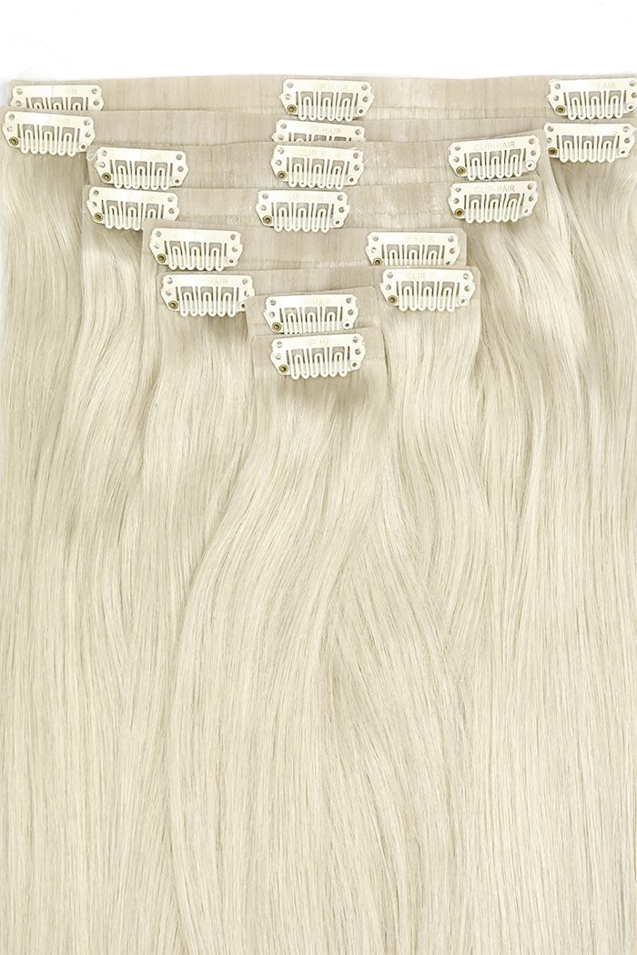 Våre Ice Blonde Double Drawn Seamless Clip In Hair Extensions er et komplett hodesett som veier 150 g. Sømmen er myk og ligger flatt mot hodet, slik at extensionsene dine nesten ikke kan oppdages. Den sømløse teknologien beskytter også håret mot å miste og floke seg.