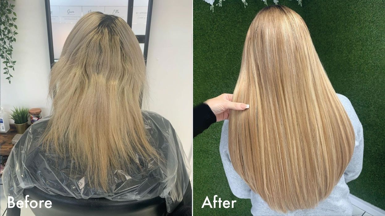 In the before and after above, the talented @hairbyshelby_x has used 14” Iceblonde Tape-In Extensions to add length and thickness to a grown out graduated bob.