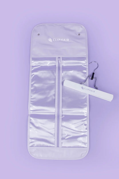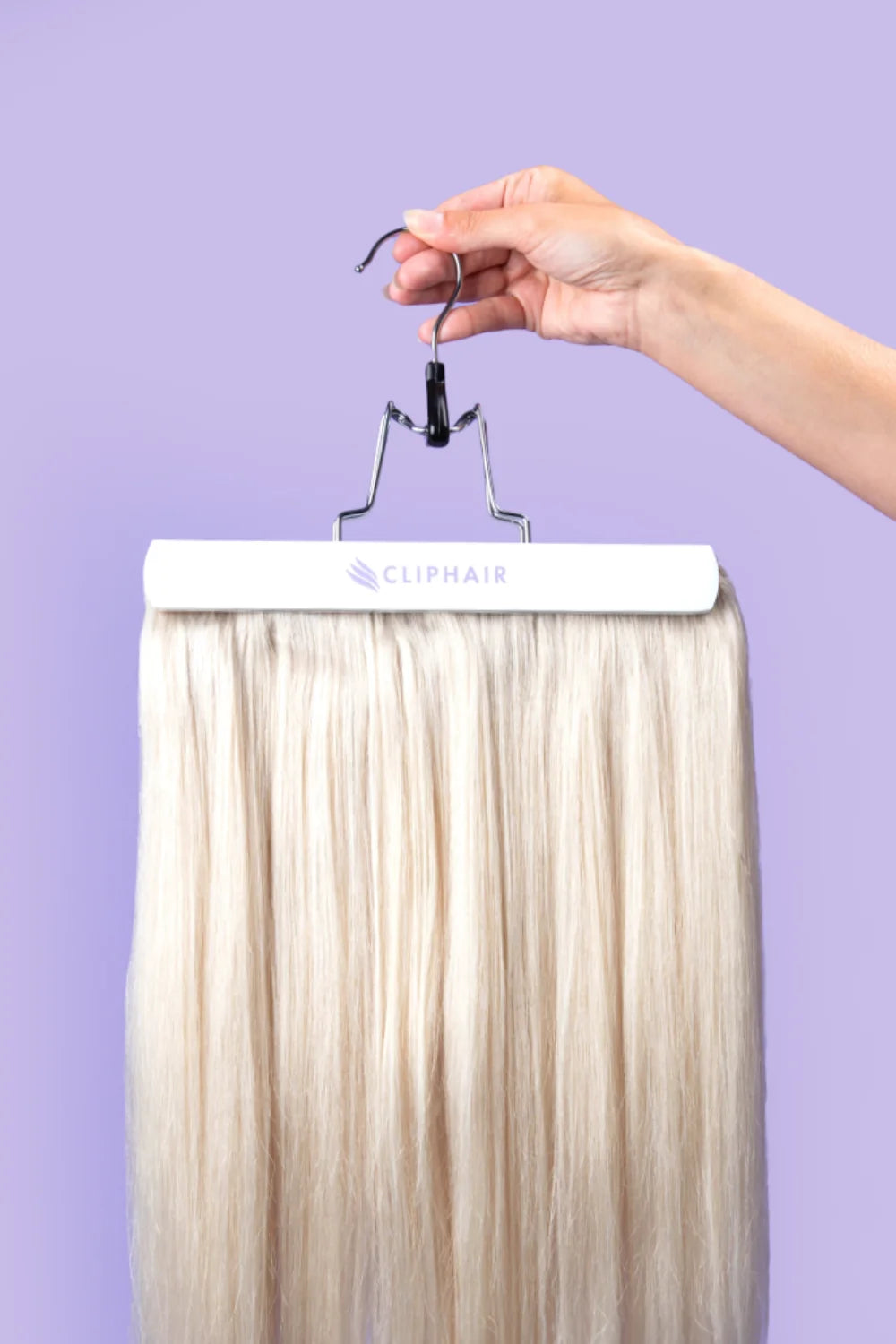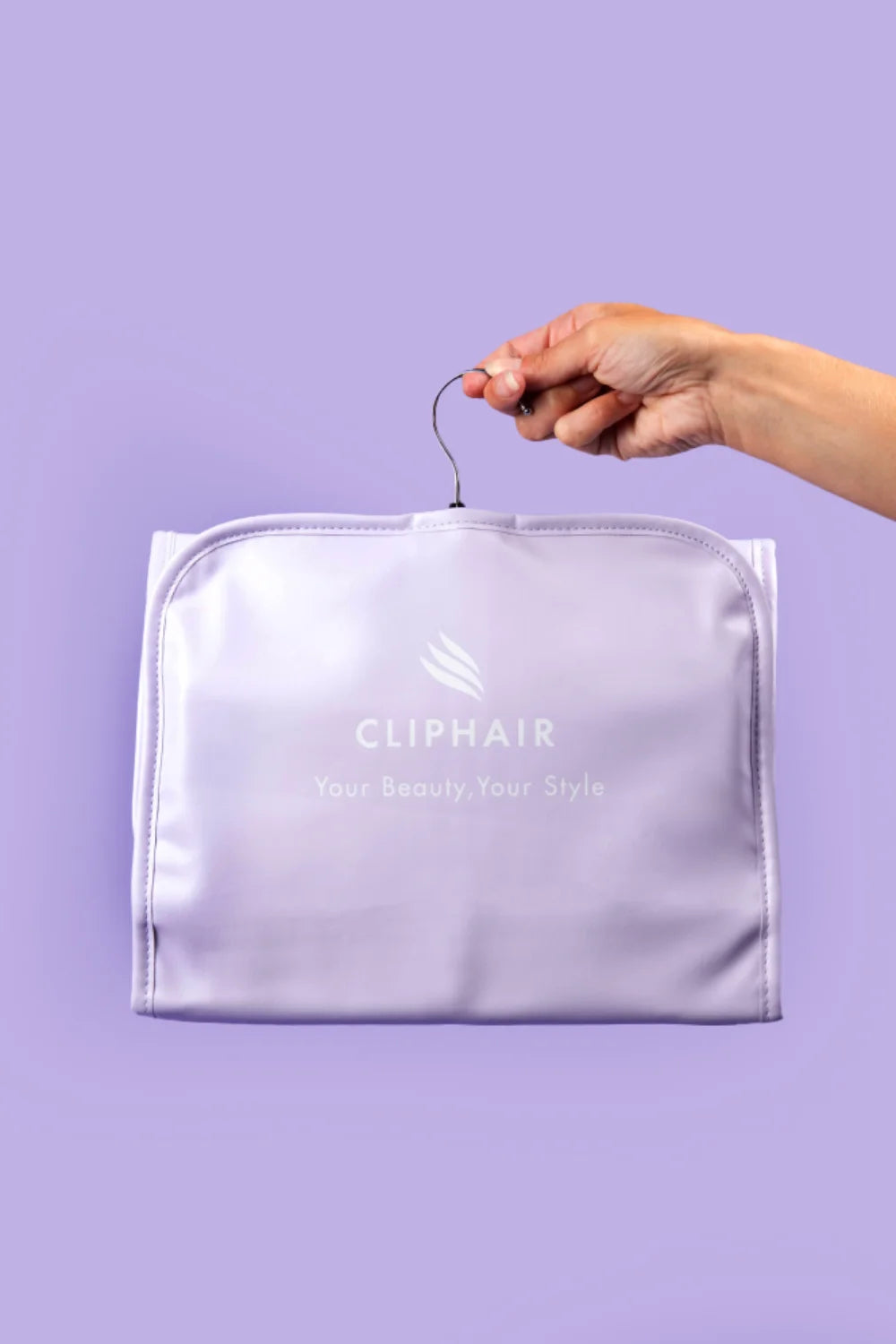 The best way to store clip-in hair extensions is by using our hair extension hanger and protective carrier. First, gently brush the extensions to remove any tangles, then securely clip them onto the hanger to keep them straight and organised. Once attached, place the hanger with the extensions into the carrier. Store the carrier in a cool, dry place, either hanging in a closet or lying flat in a drawer, to ensure your extensions remain in pristine condition until their next use. Choose Cliphair for the best carriers and hangers for hair extensions to keep your locks looking flawless every time!