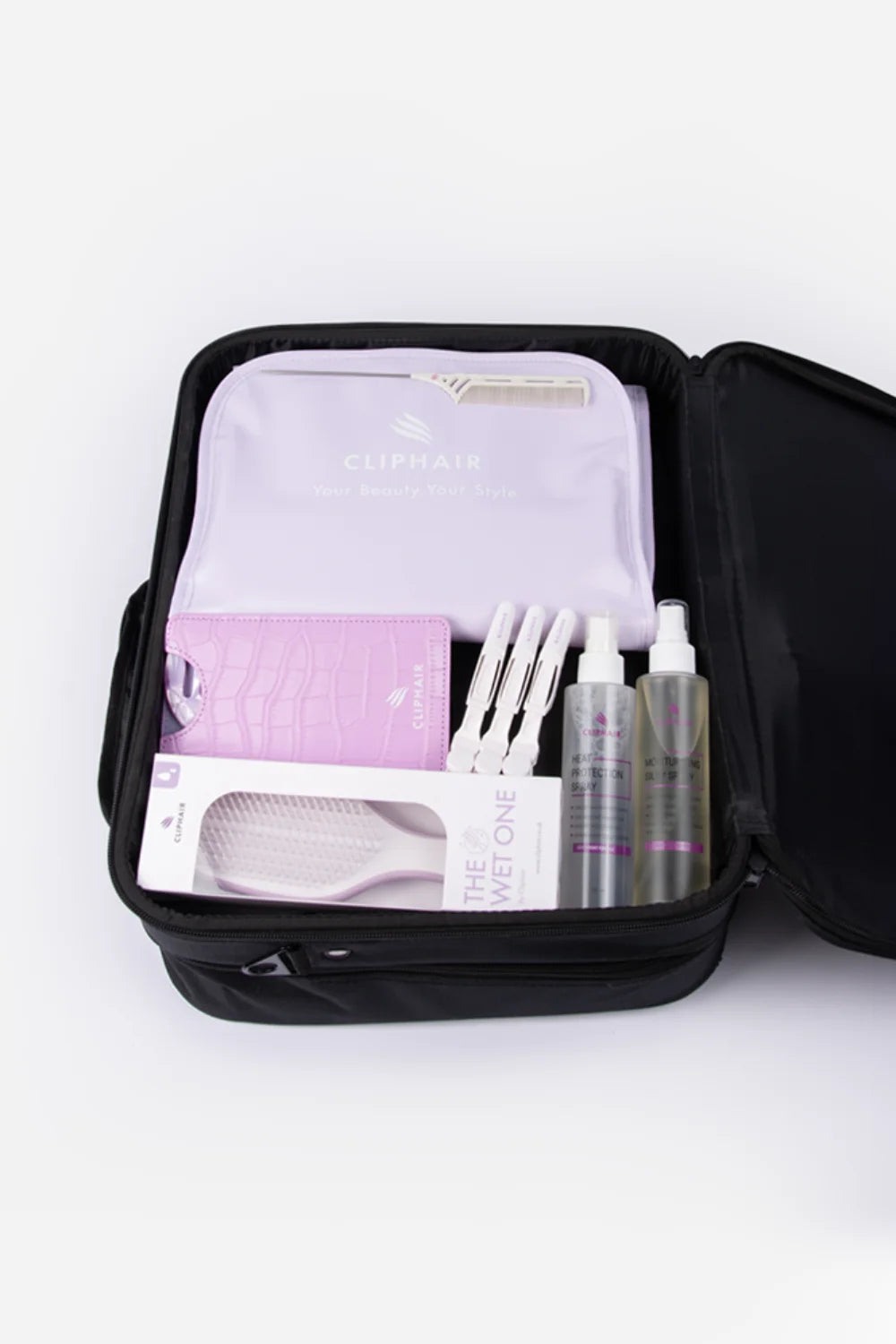 To pack hair extensions for travel, first, brush them gently with our detangling hairbrush to remove any tangles. Next, securely attach the extensions to the hair extension hanger to keep them organised and tangle-free. Place the hanger with the attached extensions into the protective hair extension carrier, which shields them from potential damage. Once zipped securely, the carrier can be laid flat or folded neatly in your suitcase to prevent tangling during travel. This method, combined with our anti-crease technology ensures your hair extensions stay in perfect condition and ready to use when you reach your destination.