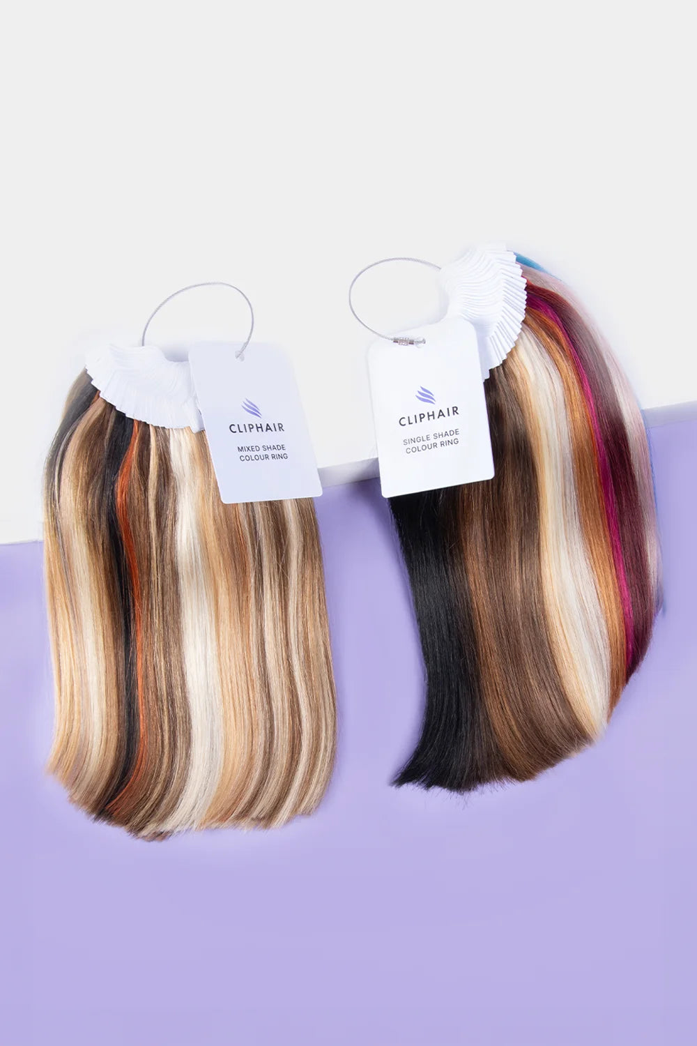 Our Single Shade Colour Ring includes all of our solid shades , making it ideal for classic hair extension styles. For those seeking multiple tones or highlights , the Mixed Shades/Balayage Colour Ring features a luxurious range of multi tonal and balayage colours. To enjoy the best of both worlds, you can purchase our bundle, which includes both the Single and Mixed/Balayage Shade rings at a discounted price.